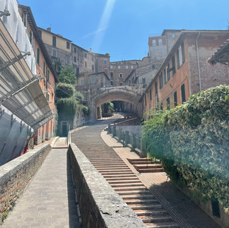 Perugia je nádherná, ale hrozně do kopce. Kvůli zónám jsme museli zastavit pod kopcem a celé to vylézt. Což je samozřejmě v pořádku, ale uf… teplo. Mají tam různé zkratky mezi domy, všechno to jsou schody, a mostky.
